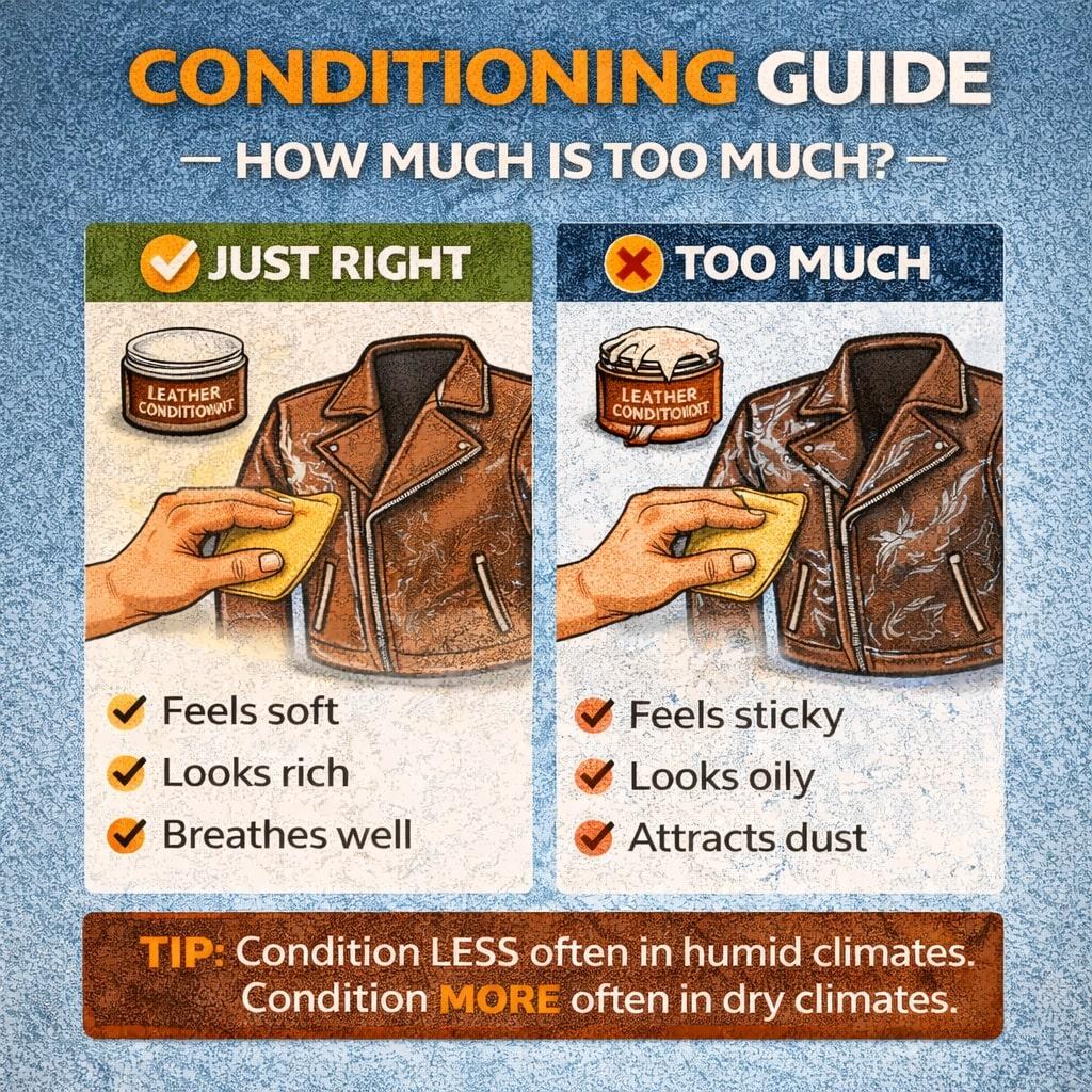 Conditioning keeps leather flexible. It replaces oils lost from heat, sweat, and time. But too much conditioner makes leather sticky and heavy.