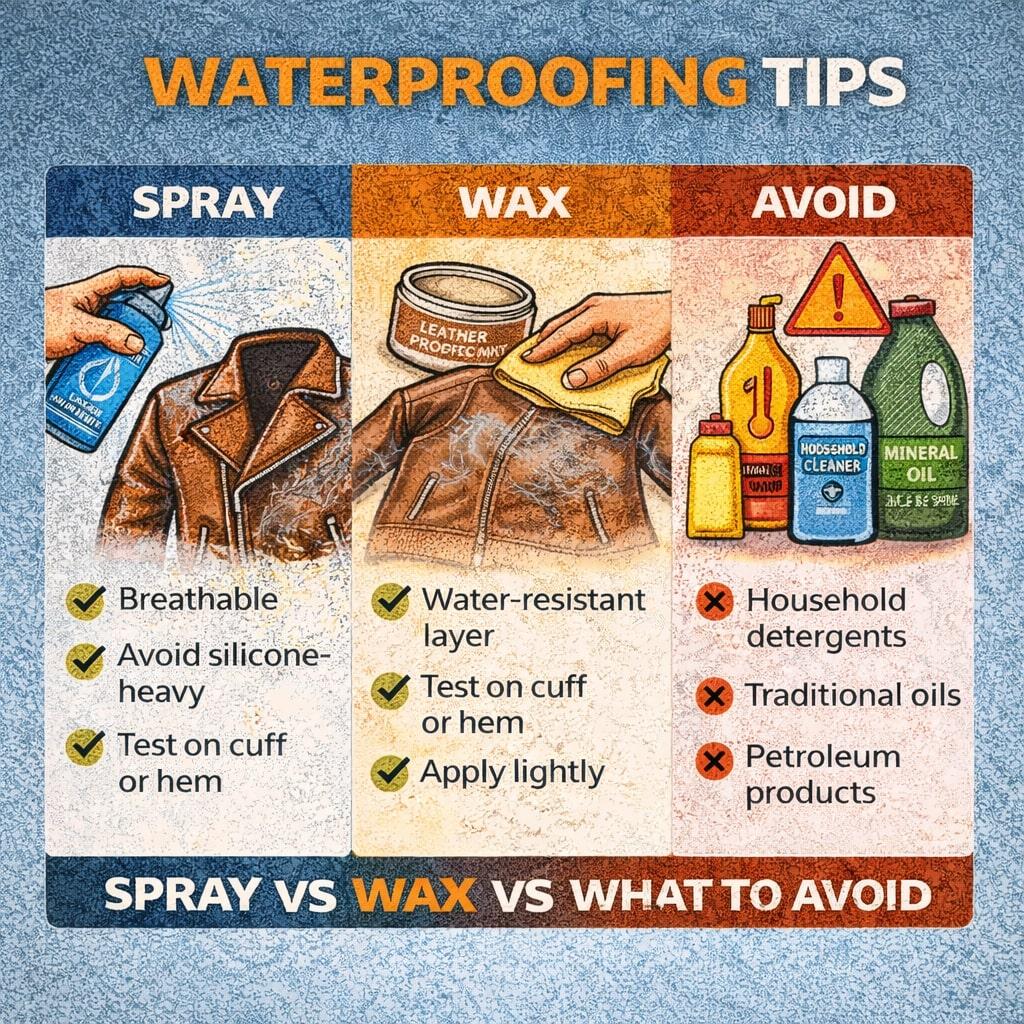 Choose a breathable water-repellent spray or wax designed for leather riding gear. Avoid silicone-heavy sprays that block pores.